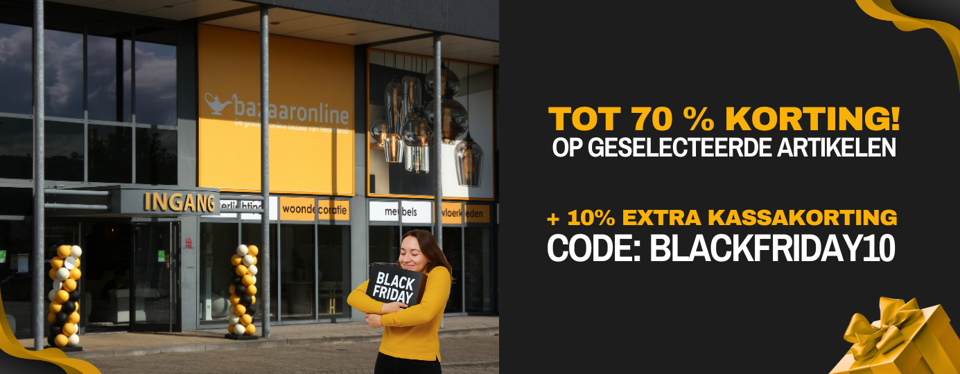 Tot 70% korting op geselecteerde artikelen + 10% extra kassakorting met code: BLACKFRIDAY10Black Friday loopt bij ons van 21 t/m 30 november en dit jaar profiteer je van extra hoge kortingen op meubels, verlichting en accessoires. Toon meer