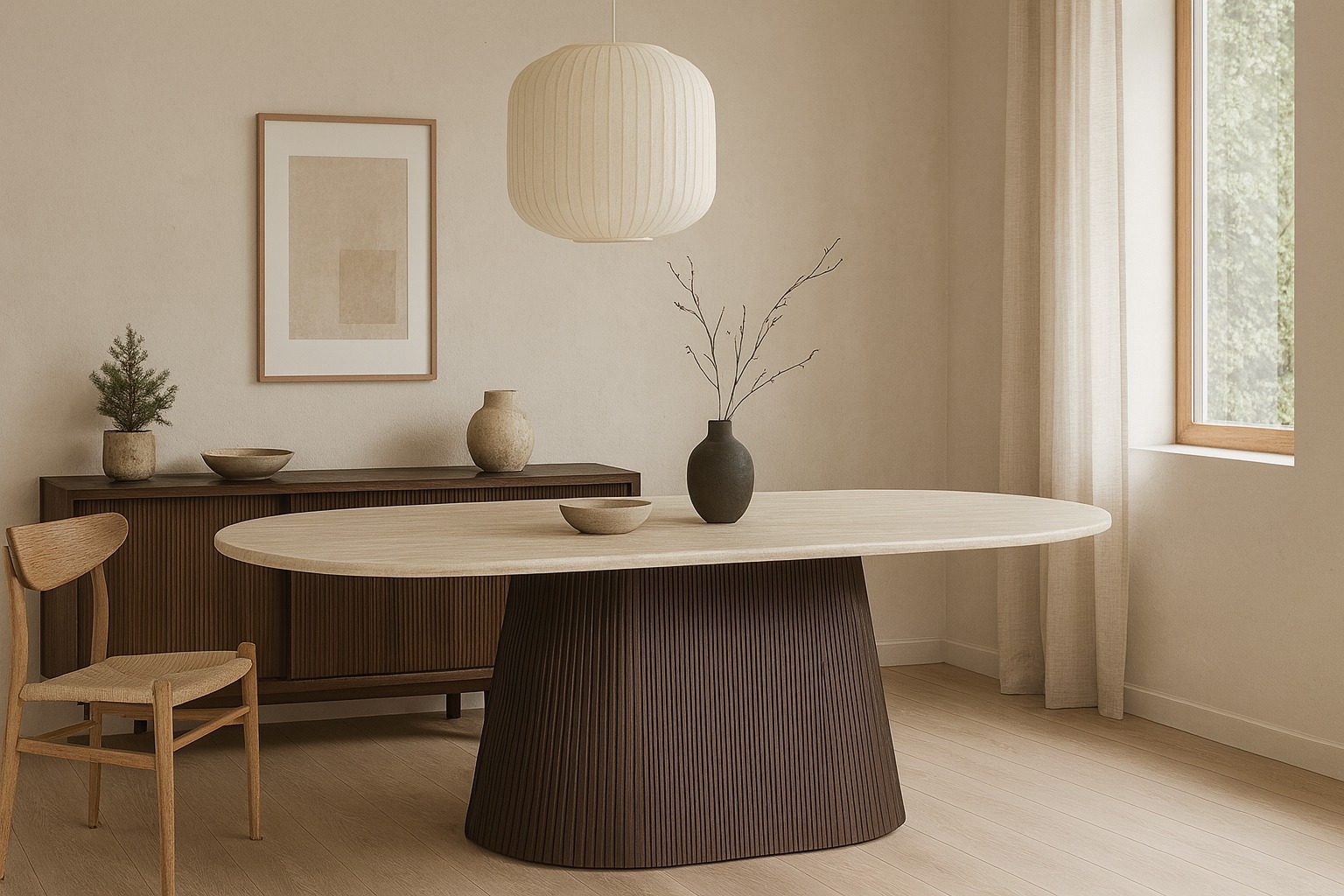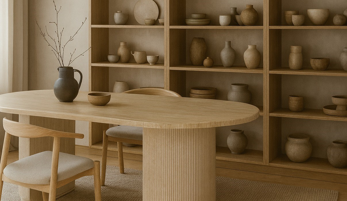 De meubels zijn vaak gemaakt van natuurlijke materialen zoals hout, linnen, bamboe, keramiek en steen (zoals travertin). Deze aardse materialen brengen een gevoel van verbondenheid met de natuur, wat bijdraagt aan een ontspannen en gebalanceerde sfeer in huis.