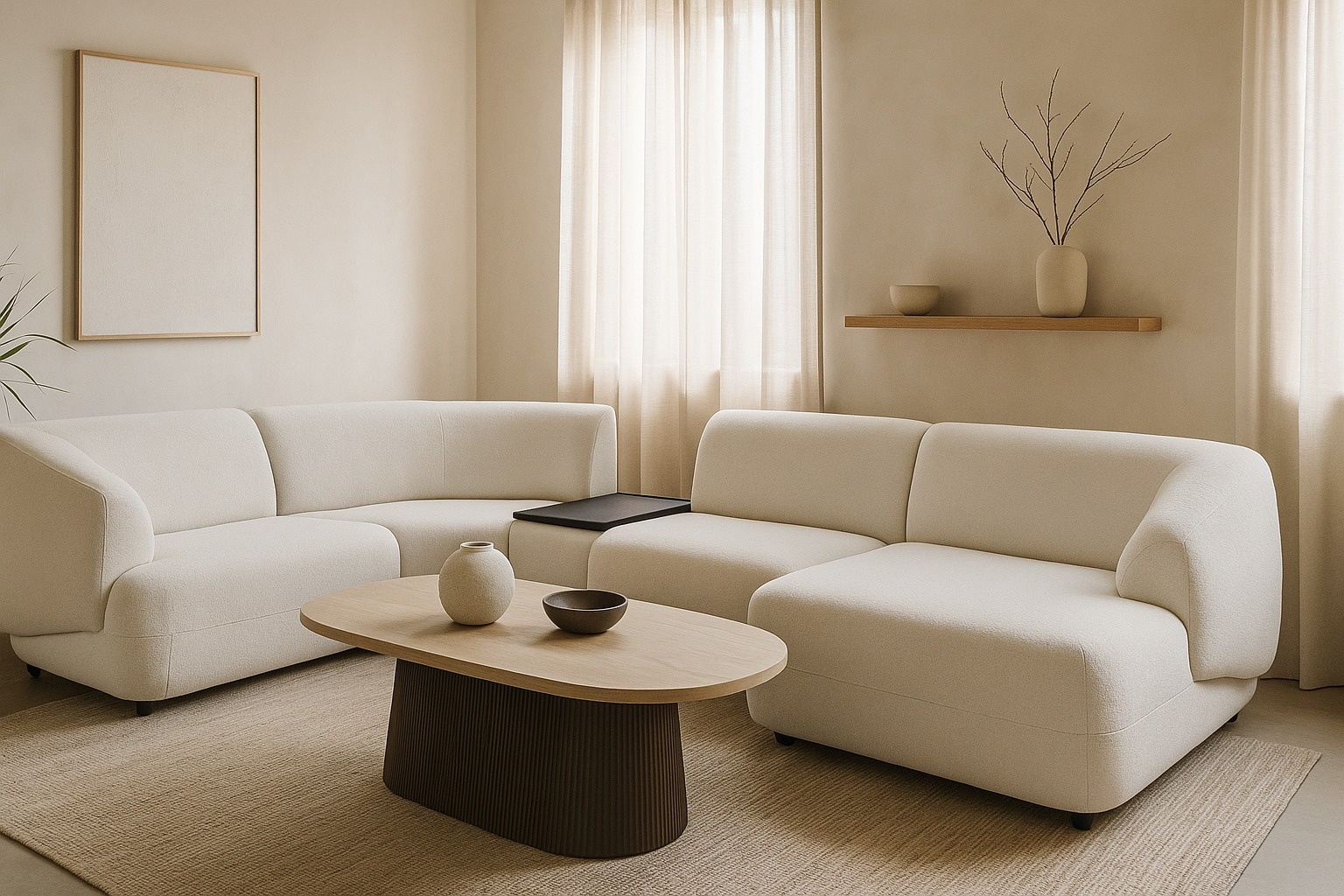 Begin met een witte Japandi bank als rustige basis. In veel huizen zijn de muren wit, en door deze te combineren met een witte bank creëer je een perfect canvas om het natuurlijke kleurenpalet van de Japandi stijl te introduceren. Denk bijvoorbeeld aan een beige vloerkleed of een bruin dienblad.