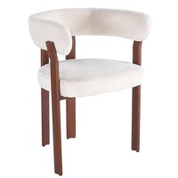Het frame heeft een donkere, warme walnootkleur. Dit vormt een mooi contrast met de zachte, lichte stof van de zitting.
