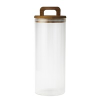 Breng stijl en functionaliteit samen met deze moderne voorraadpot van borosilicaatglas. De pot heeft een elegante verticale ribbelstructuur aan de binnenkant en een hoogwaardig acaciahouten deksel met handvat, wat zorgt voor een warme, natuurlijke uitstraling.
