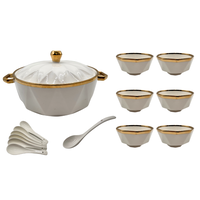 De soepterrine met bijpassend deksel houdt je soep langer warm, terwijl de zes stijlvolle kommen en lepels bijdragen aan een luxe presentatie. De grote soeplepel maakt het opscheppen van soep extra eenvoudig. De goudkleurige randafwerking geeft de set een chique uitstraling en maakt elk diner extra bijzonder.