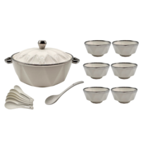 De soepterrine met bijpassend deksel houdt je soep langer warm, terwijl de zes stijlvolle kommen en lepels bijdragen aan een luxe presentatie. De grote soeplepel maakt het opscheppen van soep extra eenvoudig. De zilveren randafwerking geeft de set een chique uitstraling en maakt elk diner extra bijzonder.